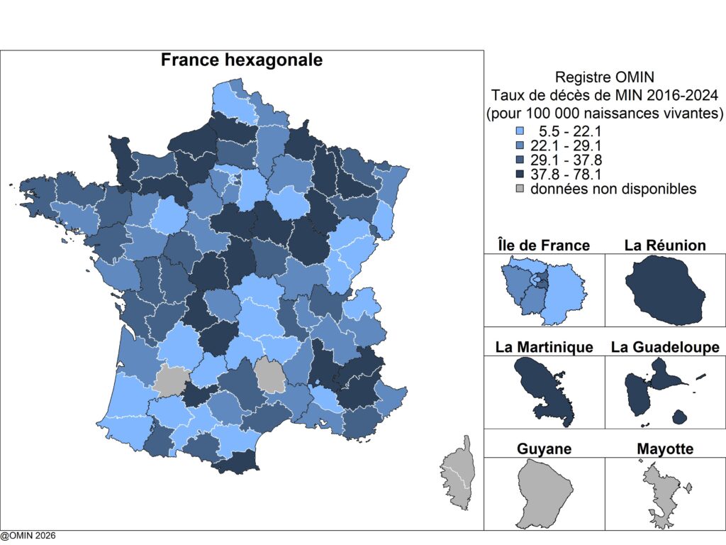 – Le recueil des données n’est pas exhaustif dans tous les départements. Les taux de décès de MIN peuvent donc être sous estimés chez certains d’entre eux.